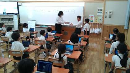 今日は「1年生をむかえる会」があり,どうがを見てもらったあと,だいひょうのせいとがプレゼントをわたしに行きました。