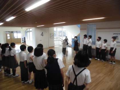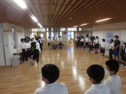 初めはクラスの前であいさつを言っていましたが,チームステージのみんなにあいさつをするために途中から代表委員がそろってあいさつをすることにしました。
