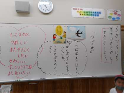 つばめをお世話する家族の姿から,「いきものにやさしくするとどんな気持ちになるか」考えました。