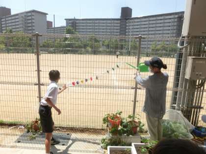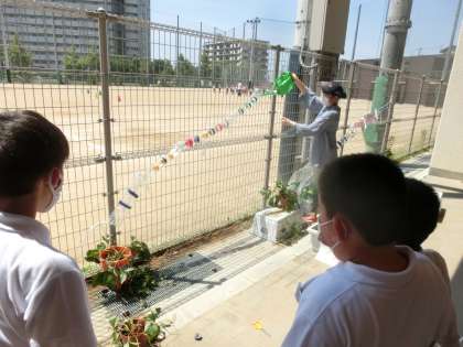 休み時間に完成した「ピタゴラ水(スイ)っち」に水を流していると,運動場で遊んでいた4年生が「なになに?なにしてるの?」とかけよってきて,一緒に「ピタゴラ水(スイ)っち」楽しみました。