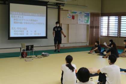 本日,前期課程教職員を対象に「心肺蘇生法講習会」を行いました。毎年講習会を開催するのですが,「コロナ禍における心肺蘇生法」を経験するのは初めての教職員もいて,倒れている人への声のかけ方や,胸骨圧迫の仕方,AEDの使い方,周囲への呼掛けなど役割を分担し,これまでとの対応の違いを確認しながら進めていました。万が一の事故の際に「生徒の命を守る」ことにつながる心肺蘇生法。その重要性を感じながら教職員一人一人が真剣に取り組む姿がみられました。