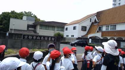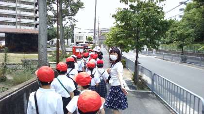 2年2組の校区探検の様子です。向島駅の近くには,自分が生まれた産婦人科医院やいつもお世話になっている学校医の眼科,クリニックなど,たくさん病院があることに気づくことができました。また,卒園した幼稚園の先生や後輩たちとも楽しくお話をすることができました。