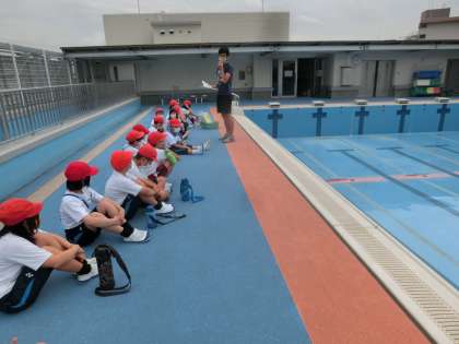 水泳学習をとても楽しみにしている子どもたち,1・2年生は初めての水泳学習ということもあり,実際にプールに行って水泳学習をするときのきまりや約束を確認しました。