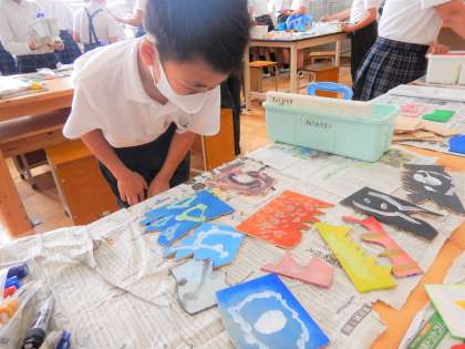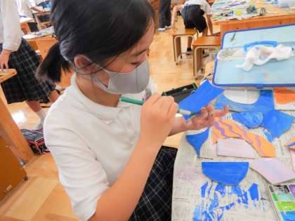 本日の図工の『糸のこすいすい』の学習では,電動糸のこぎりを使って切った木の板に,絵の具で色を塗りました。