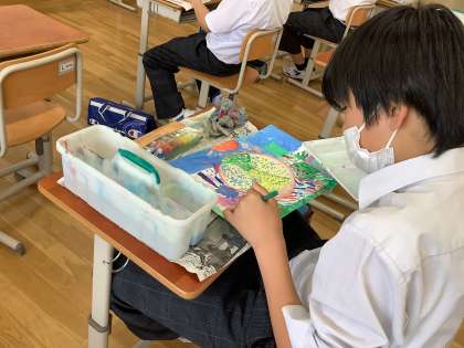 1組うえ組の美術で自分の宝物を描いています。宝物を考えるときは「自分の家族」「部活動で使っているもの」「自分の文房具」などそれぞれいろいろなものがでてきました。画用紙に鉛筆で下書きしたあと,絵の具で塗っていきます。完成がとても楽しみです。