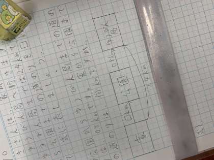 小数のわり算の学習も大詰めです。今まで積み上げてきた考え方を使うと,色々な考え方が出てきました。1つの図でも,3.4種類出てきました。