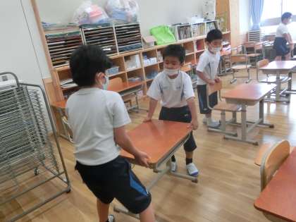 今日の学習では「つくえはこび」と「かかりのしごと」について考えてみました。まず教師のロールプレイ(うまく協力できていない場面)を動画で見せて,気づいたことを話し合いました。話し合ったあと,実際に「つくえはこび」と「かかりのしごと」をやってみました。友だちの名前を呼んで協力をよびかけたり,自分の役割を見つけて動いたり,譲り合ったりするなど,話し合ったことを活かして活動することができました。