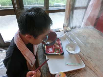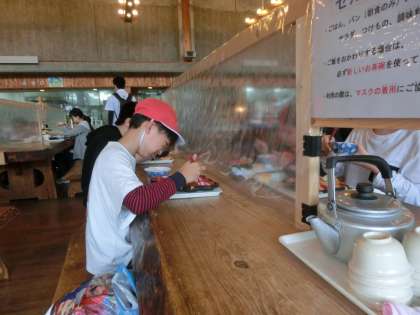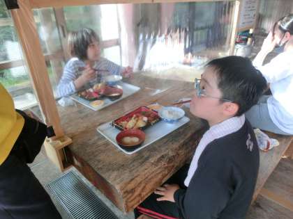 元気に活動したあとはお腹がすきます!1日目の晩ごはんは「山の家」の食堂で食べました。「エビフライ」が大人気でした。