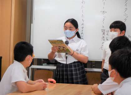 最終回に登場したのが,5年生の図書委員3名でした。それぞれのお勧めの一冊の魅力を,1分間の発表に凝縮をしてアピールをしました。