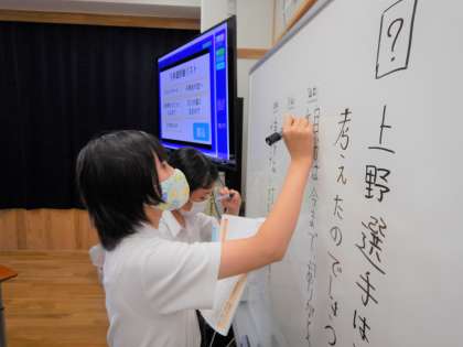 写真に学級では,『ソフトボールに恩返しを -上野由岐子-』という教材をもとに,日々の生活が多くの人々に支えられていること,感謝の心の大切さについて考えました。