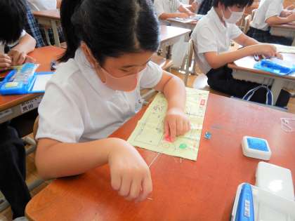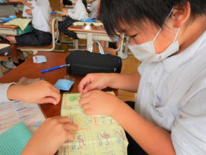 今日の家庭科の学習も,針に糸を通し,玉結び,玉止めの練習から始まりました。