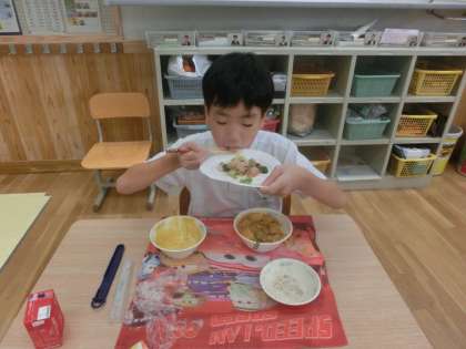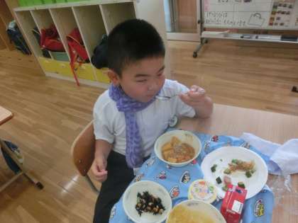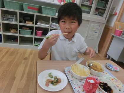 収穫した野菜は先生に調理をしてもらって給食時間に食べました。「野菜が苦手」という子も,不思議ですね…自分で育てた野菜は「おいしい!」と言って食べることができました。