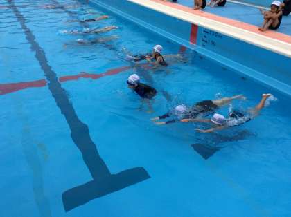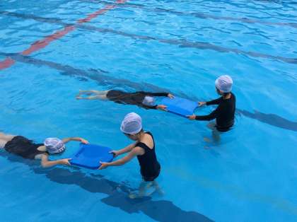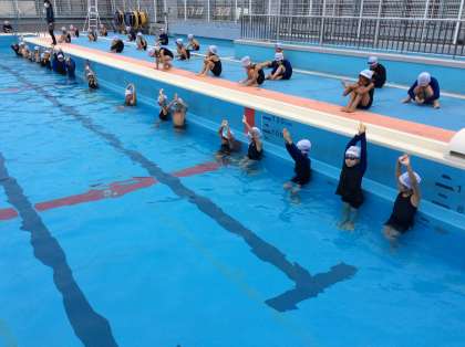 さく年はプールに入れなかったので,はじめは水にきんちょうしている人もいた,はじめてのプールから,みんなとても成長しました。