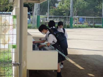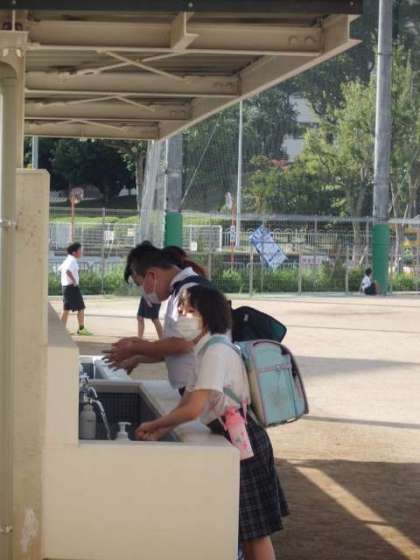 みんな、「おはようございます」の笑顔と共に手洗いをして校舎に入っていきます。手洗い場が混んでいたり、密になりそうなとき、高学年の生徒は教室前の手洗い場で洗っています。その時も「先生、上で洗うしな〜」と言ってハンカチを見せてくれる生徒もいました。