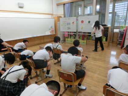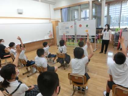 「What do you want?」「あなたは何がほしいですか?」の学習をしています。単元の最後は「ピザやさん」を開いて,それぞれがピザの具を選んでピザを作り、友だちに披露することを計画しています。2学期もたのしく英語の学習を進めていきたいと思います。