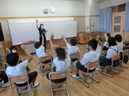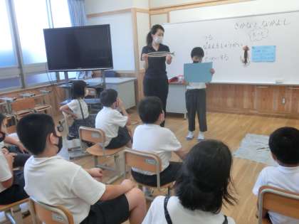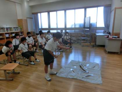 栄養教諭の廣瀬先生に食の学習「さかなとなかよし」の授業をしていただきました。給食でも魚を使った献立がたくさんありますが,「魚が苦手」という生徒もいます。「魚よりお肉のほうがいい」「魚は骨がたくさんあるからイヤ」…そんな生徒は「さかなとなかよく」なれるように,魚が好きな生徒は「もっとさかなとなかよく」なれるように,魚つりをして魚の名前を覚えたり,クイズをしたり,手作りの教材を使って「魚の骨が簡単にとれる方法」を教えてくださったりと,とても楽しい授業をしていただきました。授業の振り返りでは「給食で魚が出るのが楽しみになりました」と感想を発表していました。