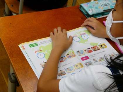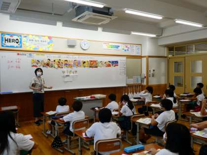 先生に質問したり,友だちとやり取りをすることで,外国語に慣れ親しんでいる姿も見られました。