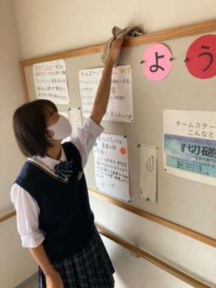現在緊急事態宣言中なので,学年をまたいでのピア清掃ができていません。そこで,7年生は,「掃除レベルアップ期間」と名付けて,自分たちの掃除を前向きに,積極的に取り組む活動を行っています。生活環境委員,代表委員,班長が話し合いを行い,いつもの掃除にプラスアルファを付け足していくことを目標に,掃除を行っています。この期間中,7年生の意識が変わり,細かいところや,普段掃除をしていないところまできれいにしている姿が見られます。これからも下級生の手本となる姿を示していってほしいと思います。