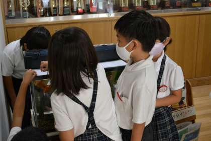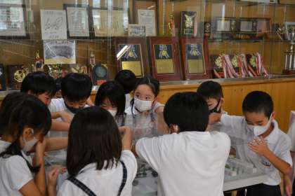 授業の様子を見ようと廊下に出たら,1年2組の生徒たちが列をなして職員室の方へ歩いてきました。「どこに行くの?」と訊くと,「金魚見に!」との返答。1年生は靴箱もグランド側にあり,余程の用事がないと職員室の前までは来ません。もしかしたら,金魚がいることも知らなかった人もいるかもしれませんね。ついでに隣にある,校舎のミニチュア模型にも張り付いて見る1年生でした。