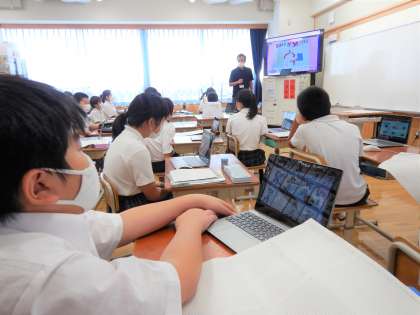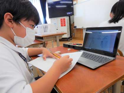 今日の理科の学習では,夏休みに取り組んだ自由研究の発表に向けての準備を進めました。写真は,ポスターの発表原稿を書いている様子と,GIGA端末に音声を録音している様子です。