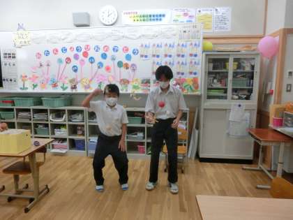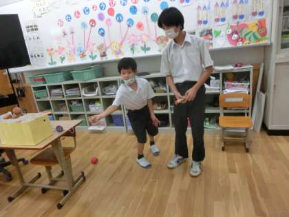 1組の「けんだま名人」をゲストに迎えて「けんだまあそび」をしました。けんだまは体体幹強化と集中力アップに効果的といわれています。はじめてけん玉をする生徒もいましたが,身体全体を上手に動かしながら練習していました。けんだま名人にアドバスをもらうと上手にできるようになった生徒もいました。「休み時間に練習をして名人になる!」と「けんだまあそび」がとても気に入った様子でした。