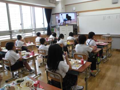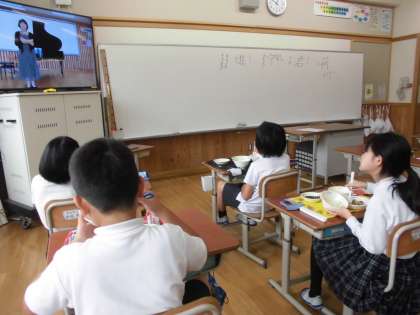 今日は給食の時間に,実習生のお姉さんたちによる「リモートミニコンサート」が開かれました。