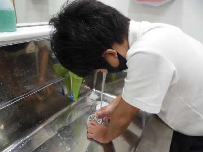 鏡を拭いたり,シンクの部分をスポンジでこすったりと