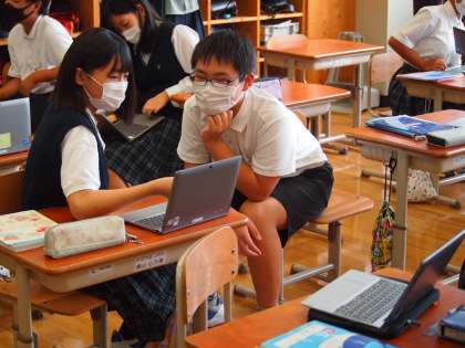 さて,本日の授業。「比とその利用」の単元です。宿題として出されていた「家で見つけた比」をGIGA端末を用いて交流します。「だし」のラベルに,そばやうどんのスープを作る際の水との比を発見した生徒や,コンピュータの画面のタテと横の比を表す表示を発見した生徒もいました。交流により,生活の中の「比」の存在に気が付いたところで,実際に比を利用する学習に移っていきました。