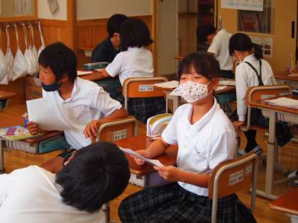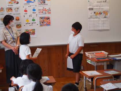 4時間目,今度は3年生の教室で外国語活動の研究授業が行われました。本校では,英語のコミュニケーション力を高めようと,9年間を見据えたカリキュラムを作成し,取り組んでいます。