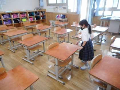 掃除が終わり,みんなが手洗いをしている時,1人教室に残って,机を足元の目印に合わせてくれている1年生を見かけました。