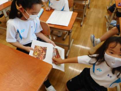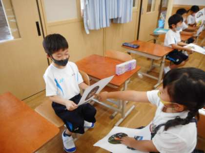 かくれんぼいきものカードが完成し,今日は友だちにかくれ方やすごいを伝えました。