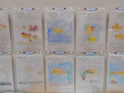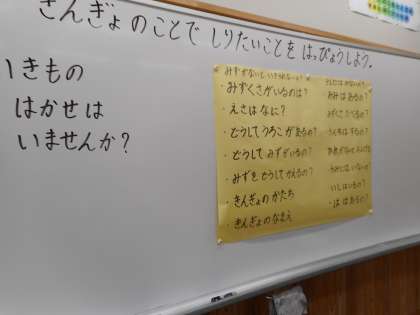 向島秀蓮小中学校で飼っている金魚のことでもっと知りたいな,と思うことをたくさん発表しました。