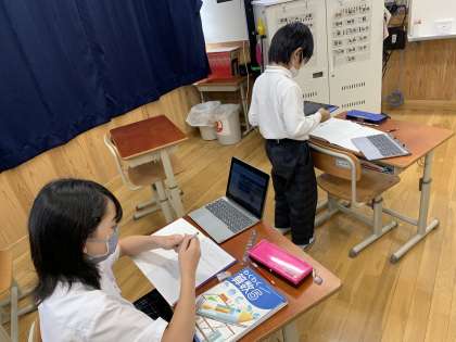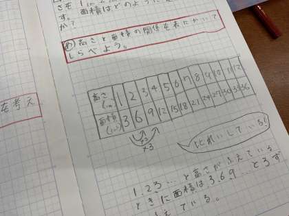 面積の学習も大詰め。今回は、高さと面積は比例しているかを考えました。「表にすると変わり方がわかりやすくなる!」という子どもたちの発言から、表からきまりを見つけ、比例しているかを調べていきました。ロイロノートの使い方も上達し、「先生!表のきまりをロイロノートで提出したいです!」と、今では自分たちで効果的に活用する姿が見られるようになり、感心しました。