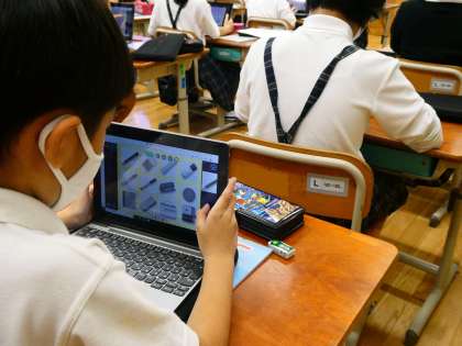 外国語活動の時間では,GIGA端末を使ってペアの友だちに文房具セットを作りました。子どもたちは,チャンツやキーワードゲームで文房具の言い方に慣れ親しみ,楽しみながら外国語を使っています。来週の外国語活動では,作った文房具を外国語で伝えます。