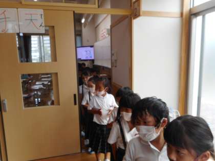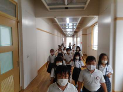 7年生から教えてもらった避難経路で,洪水の時に3階の体育館に避難をする練習をしました。