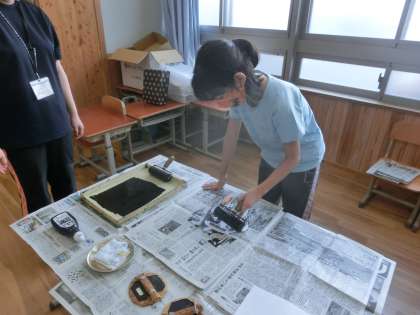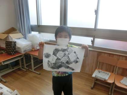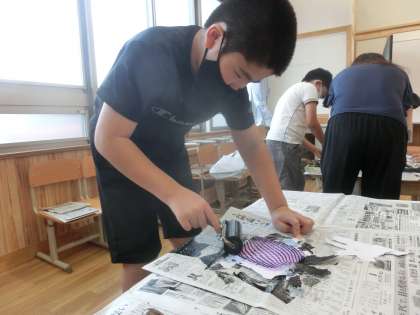 紙版画に取り組んでいます。先週は画用紙と写すと楽しい素材を使って「海の生き物」の型紙を作りました。今日は型紙にインクをつけて版画用紙に刷りました。はじめはまっ黒のインクに驚いていた生徒もいましたが,型紙にインクをつけるときは真剣な表情で取り組んでいました。