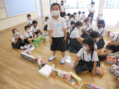 28人みんなで,箱や筒を使って楽しみました。