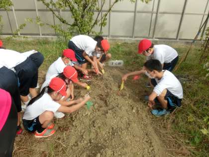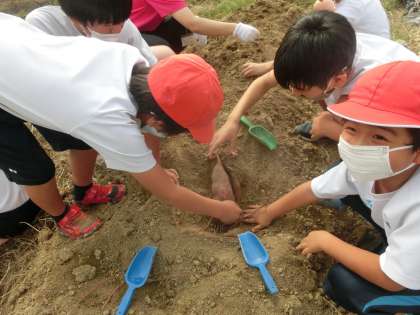 「みのりの秋」です!畑のさつまいもを収穫しました。「いもほり大会だ!」「ほるぞぉ!」「大きいおいもがいっぱい」「すごい!まだまだ長いぞ!」と子どもたちは大喜びでした。思っていたよりたくさん収穫することができました。「どのさつまいもが一番大きいかな?」ということで,最後にみんなでさつまいもの重さをはかったり長さをはかったりして盛りあがりました。収穫したあとはもちろん「おいしそう」「食べたい」…ですよね!みんなで収穫祭を計画しています。楽しみがまた一つ増えました。