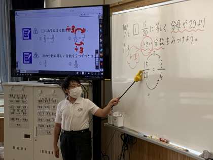 分数の学習が始まり,今日は約分について学習しました。等しい分数の学習を生かして,色々な考えが出ました。これからは,答えが出ても,もう一度約分ができないかをしっかりと確認する習慣をつけていきましょうね!