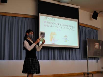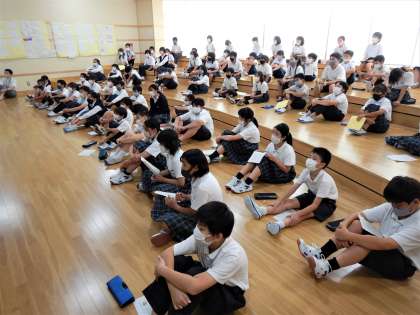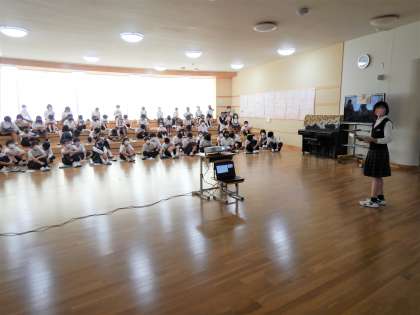 今日の蓮花タイムの学習では,それぞれのクラスで投票により選ばれた代表者が『向島秀蓮KIZUNAプラン』を学年集会の場で発表しました。