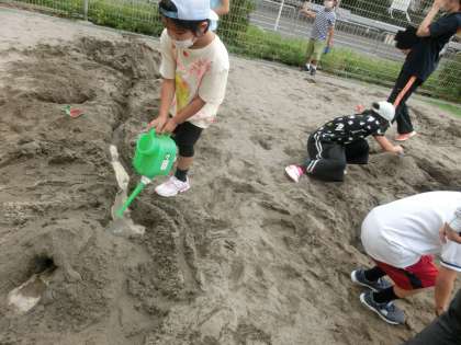 「水がほしい!」「お水を流したい!」遊んでいるうちに「水」があればもっと楽しいのでは…!?と気づいた子どもたちでした。