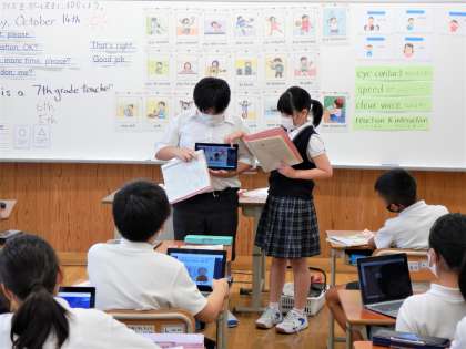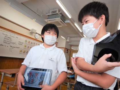 今日の英語科の『He can run fast. She can do kendama.』の学習では,来週水曜日に行われる『グローバルコミュニケーション活動』に向けて,ポール先生に発表を聞いてもらいました。