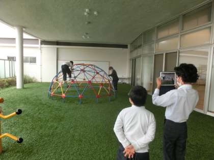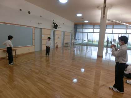 グループごとに練習の様子を動画に撮っているのですが,その動画をつないで1つのお話を作るというめあてにむかって学習しています。グループごとに動画を撮りたい「場所」を決めて,教室では撮れない楽しい動画にしようとがんばっています。今日は「低学年広場」「武道場」「給食室前ホール」にわかれて動画を撮っていました。