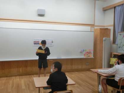 委員会活動に意欲的に取り組んでいる4年生,今日は生活環境委員会の生徒が「十の宣言」の取組を表彰しに来てくれました。「時間を守る」「早めに授業の準備をする」をきちんと守れたこと,これからも継続して取り組んでほしいことを話していました。