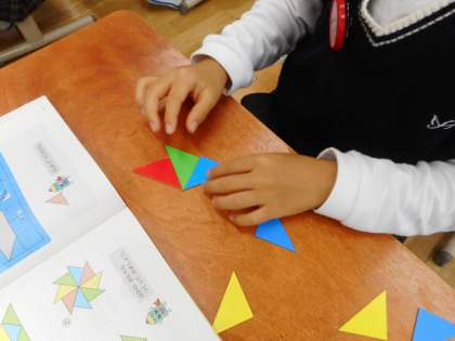 はじめの時間は色板を使って,お手本と同じ形をつくっていきます。