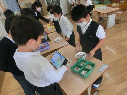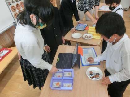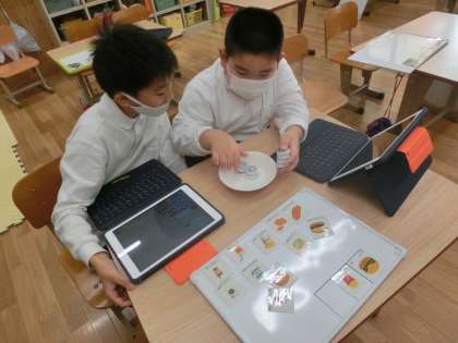 GIGAタブレットにある「レジスタディ」というアプリをつかって「かいもの」の学習をしています。「かぞえめいじん」「くみあわせめいじん」「はなしあいめいじん」「おつりめいじん」「ぴったりめいじん」の中から個別のめあてを決めて取り組んでいます。「おかいもの」が上手になってきた子どもたち,50円と10円を組み合わせてお金を払ったり,予算のなかでどれが買えるか計算したりしていました。