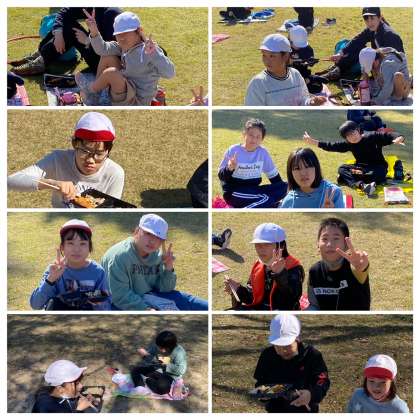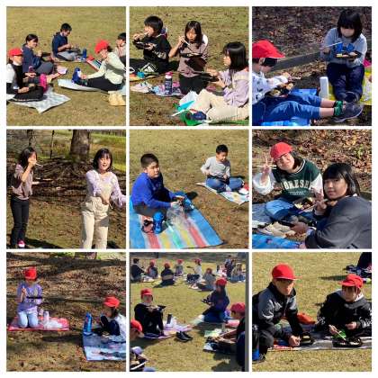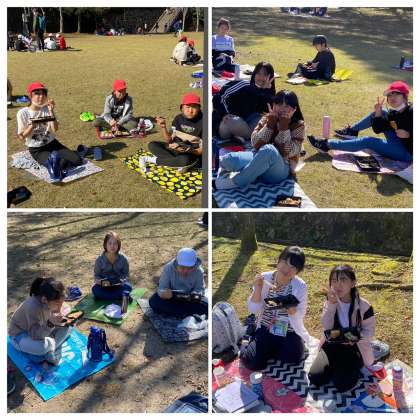 お昼ご飯の様子です。虫が飛んでくるようで、あちこちで悲鳴が…。これも自然の中ならではの体験です。