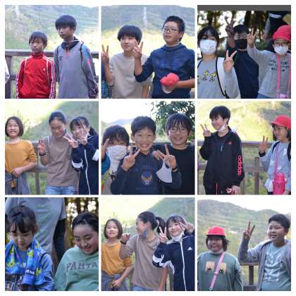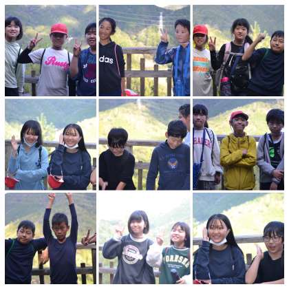 午後からはハイキングと陶芸体験とに分かれての活動です。私はハイキングに参加しましたが、ハイキングと言うよりは登山と言う方がぴったりなくらいでした。「もうダメ」と言いながらも登り切り、展望台で記念写真です。ここでの写真は記念撮影をしている横から撮ったものです。写真撮影のためにマスクをはずしています。