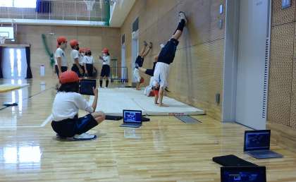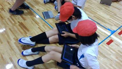 マット運動では,お互いにGIGAで動画を撮影し,友だちが技を習得するためにアドバイスカードを作成してもらったアドバイスカードを参考にしながら技の習得に向けて取り組んでいます。