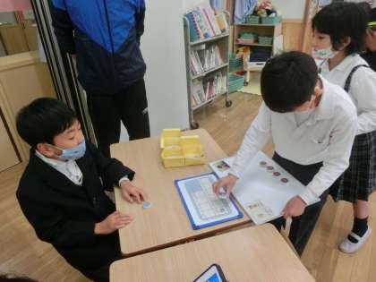 お店屋さんの生徒は「大きいポテトは買えないけど,小さいポテトなら買えますよ」など,お金が足りないお客さんに優しくアドバイスをしてくれました。